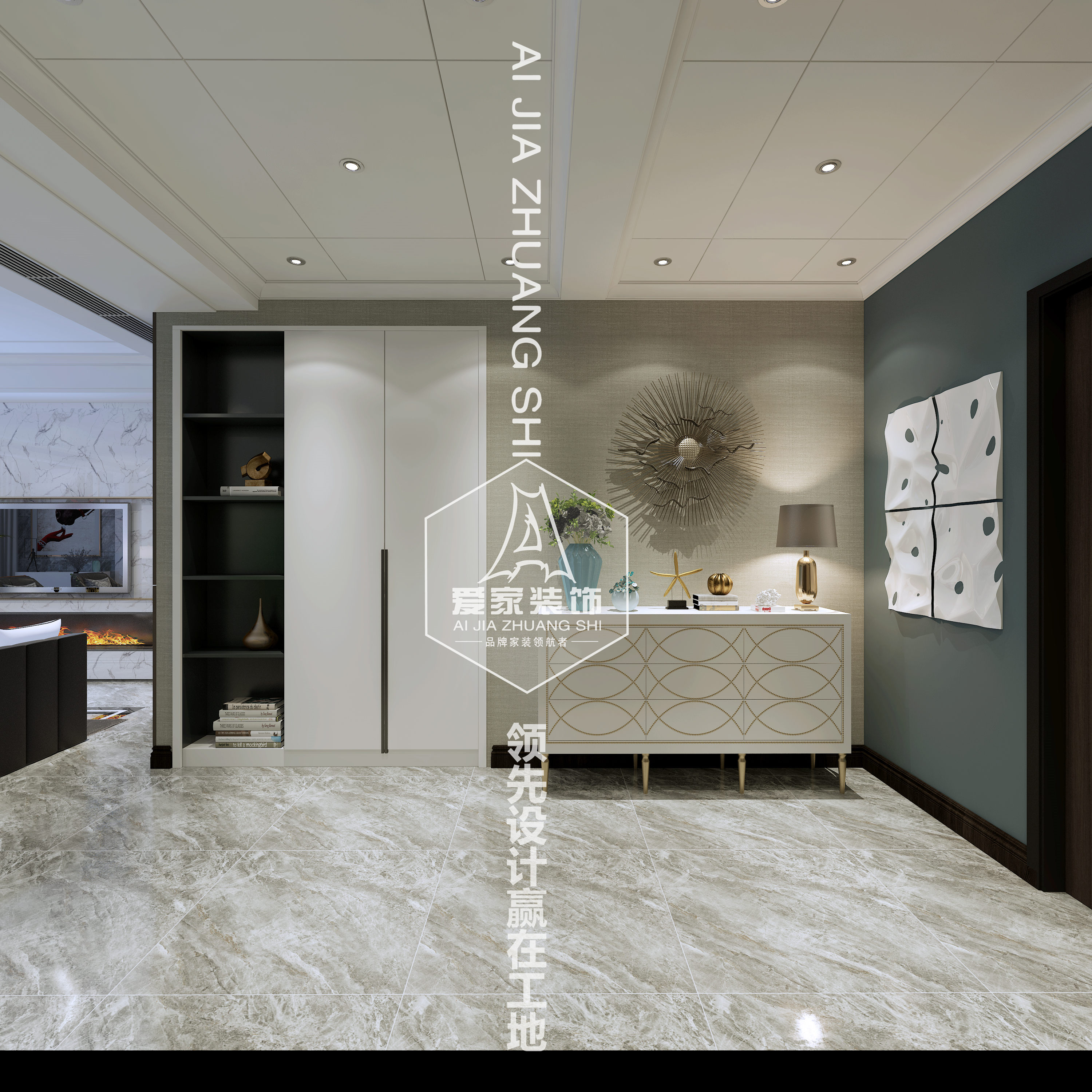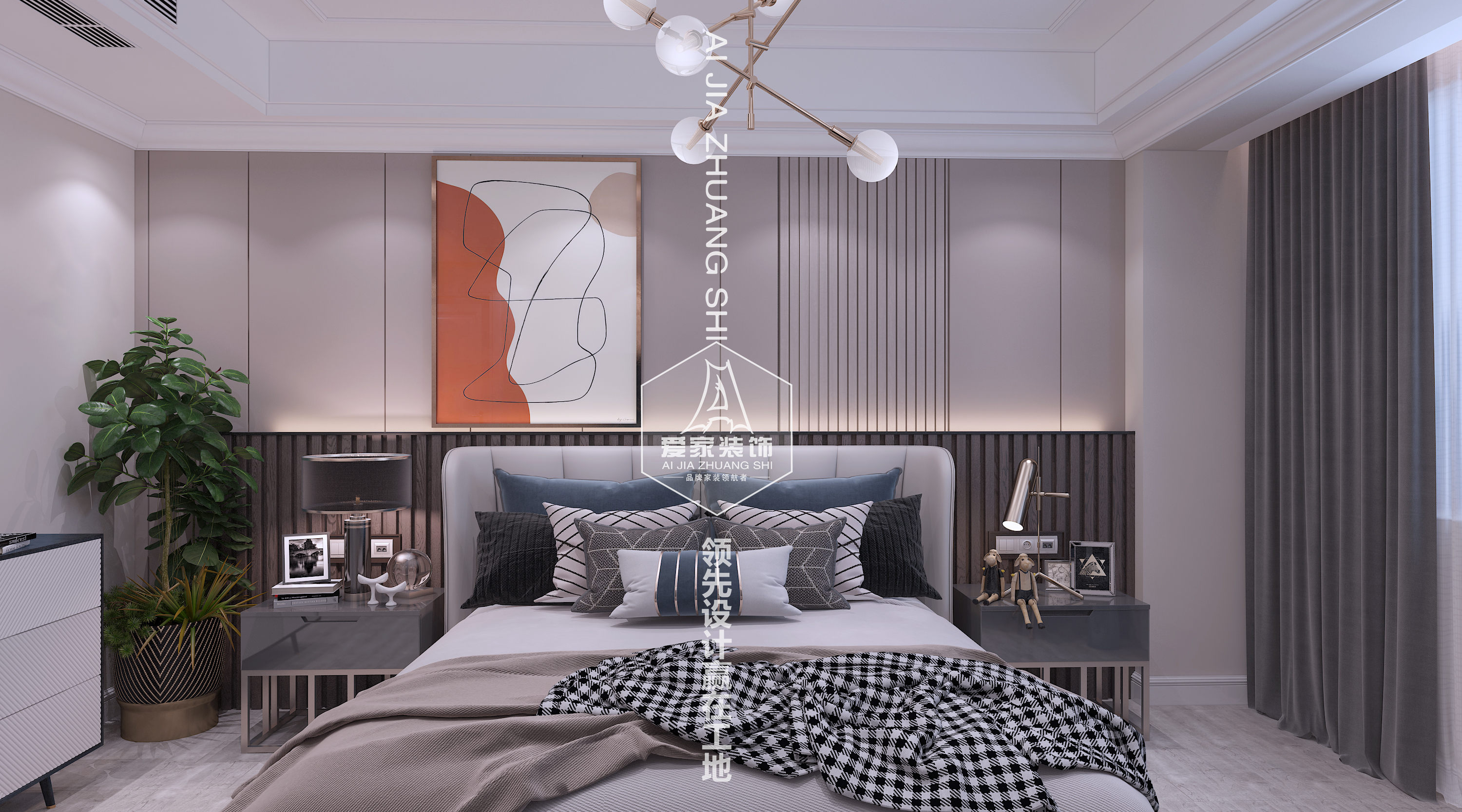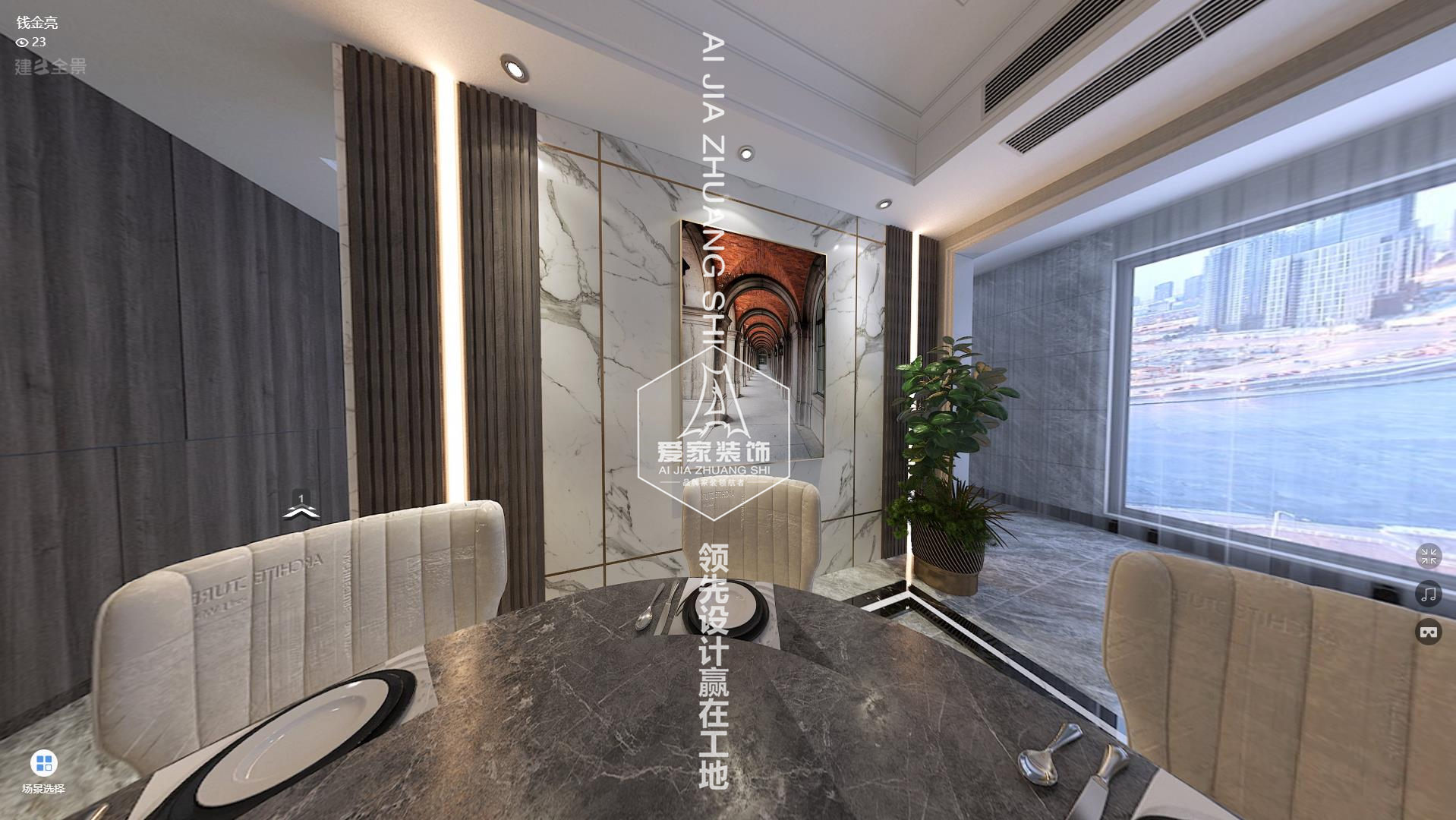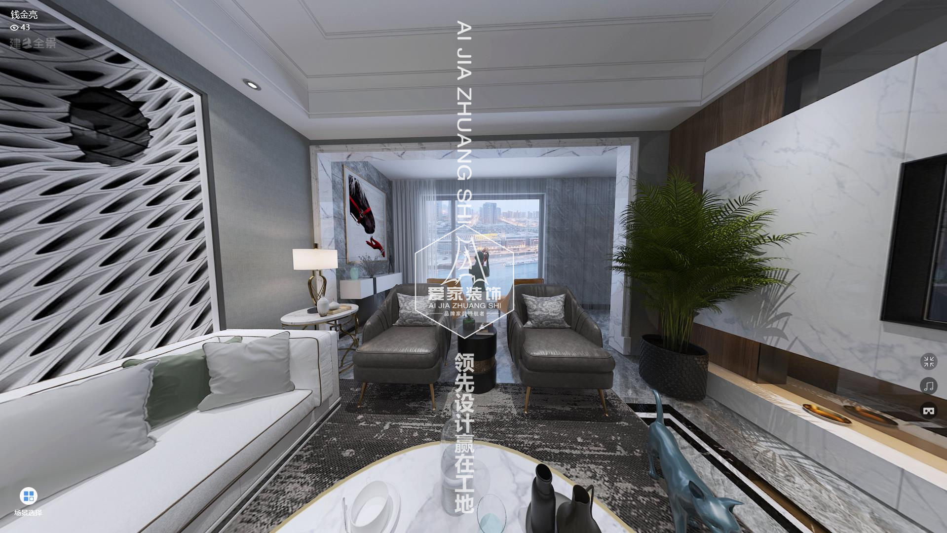 主要材料:護墻板、大理石、抽象畫(huà)、自然植栽